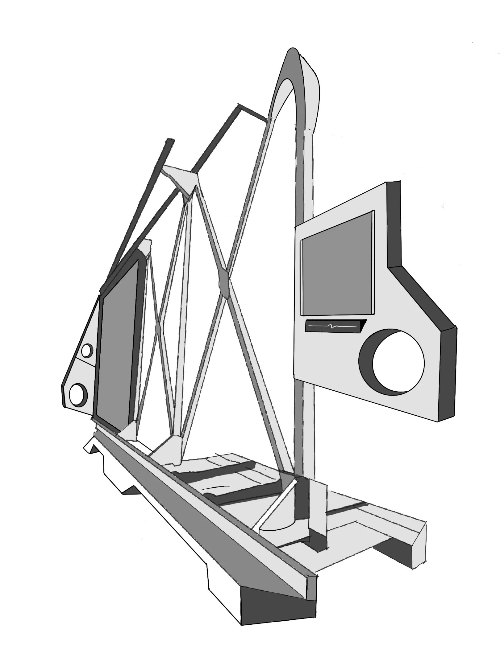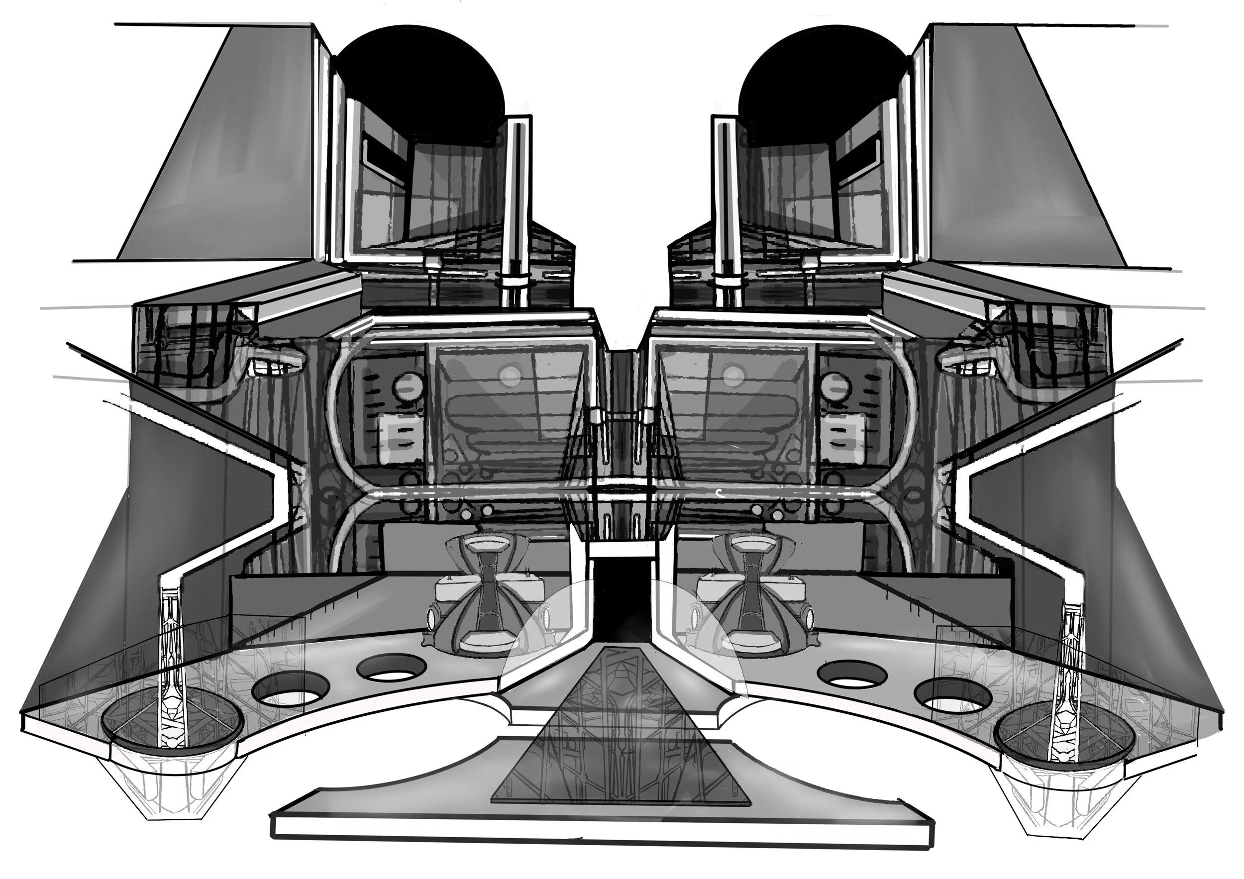 Exploring the structure of Spaceships, I developed a series influenced by films : Star Wars, Alien with the potential for these drawings to be used as concept art for larger scale props/ set.