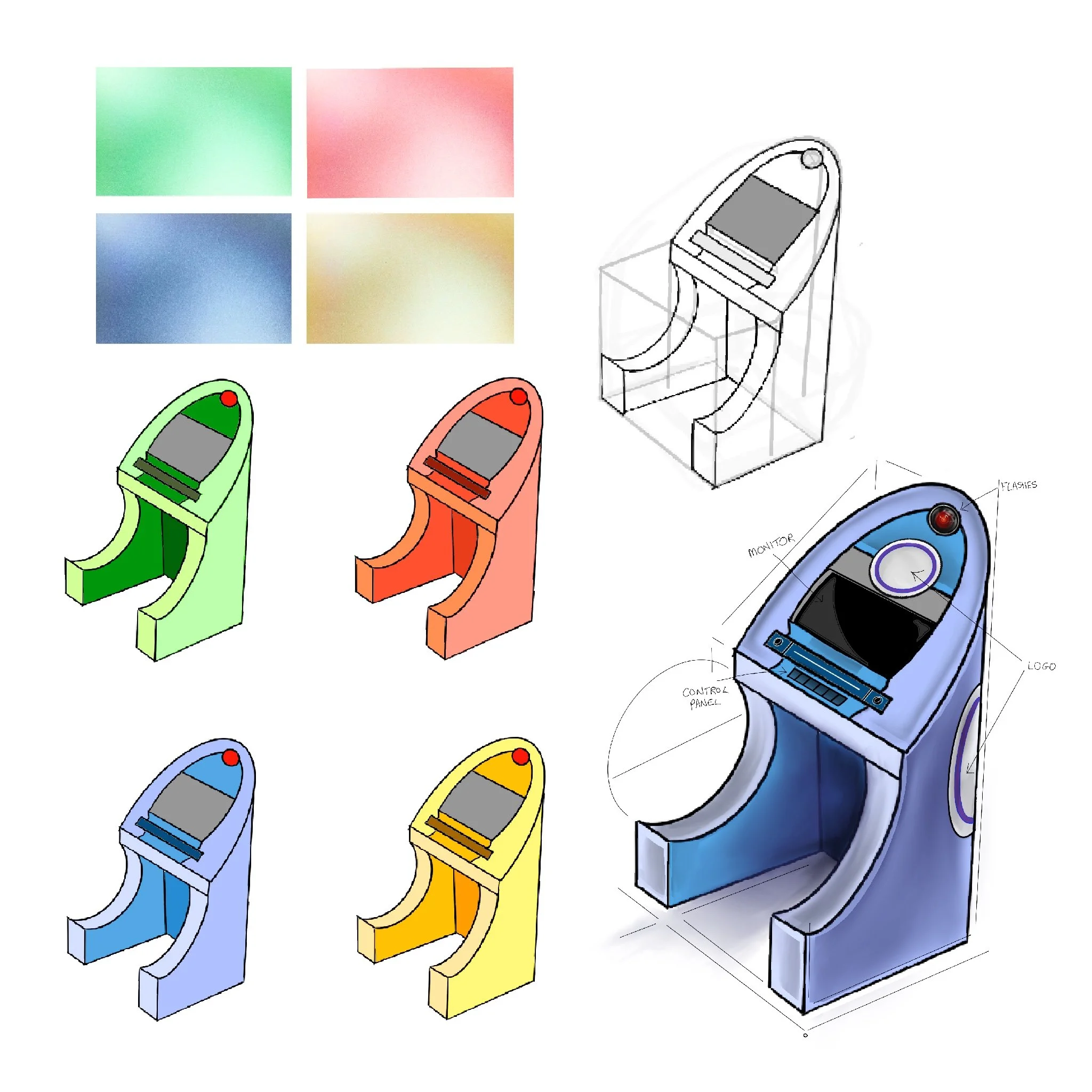 Creating various different podium designs that could be used for in house TV Games shows. Focusing on a Children’s Game Show set in space I developed various coloured options - suggesting 4 teams, screen in centre and a panel for answering the questions, glowing red light above for interaction and a logo of the show on back base. -