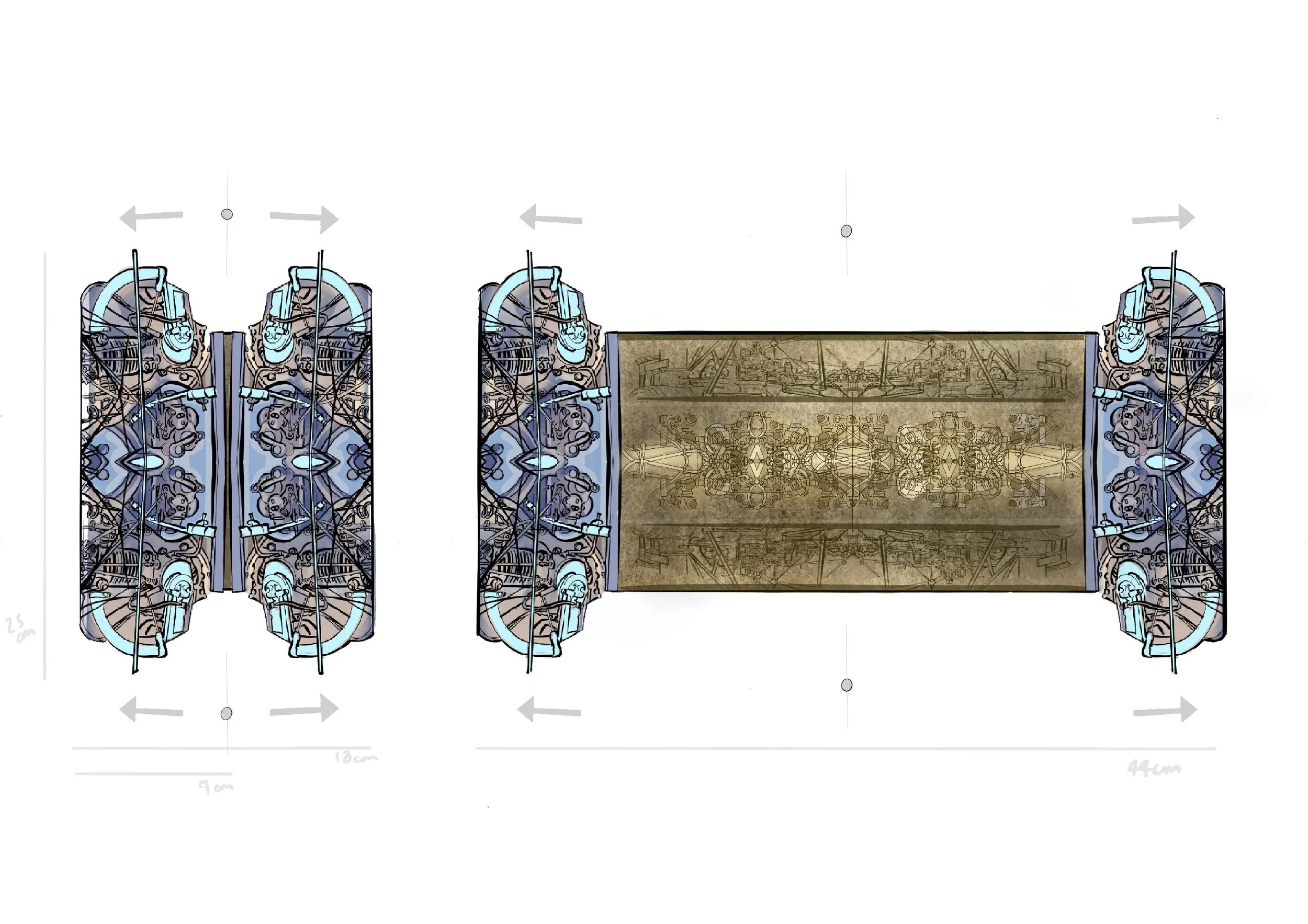 Aztec scroll prop design. Looking at films with adventure and history - [The Goonies and Indiana Jones] I drew out a prop that opens horizontally unveiling an old treasure map inside. The light. blue having an active glow and within an old stained map made out of thick scroll paper